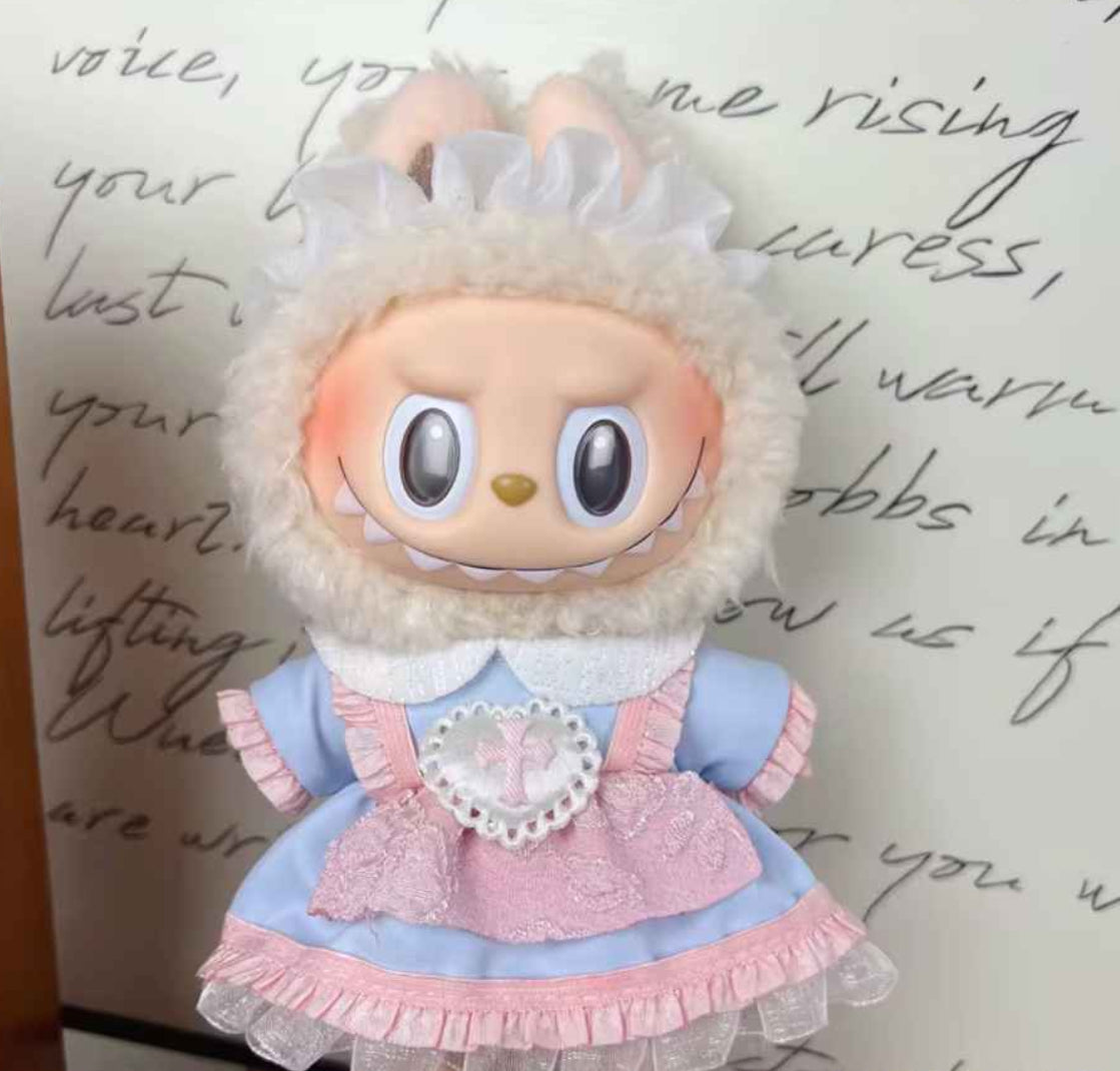 This is for one handmade maid outfit for your 17cm doll. The outfit comes with a ruffle head piece and a pink and blue ruffle dress with a cross. They’re handmade so each piece may differ slightly.