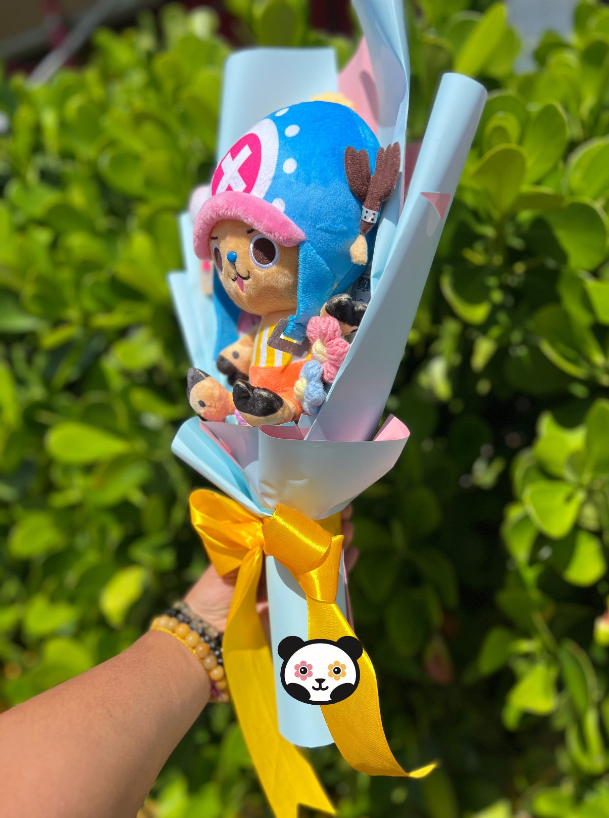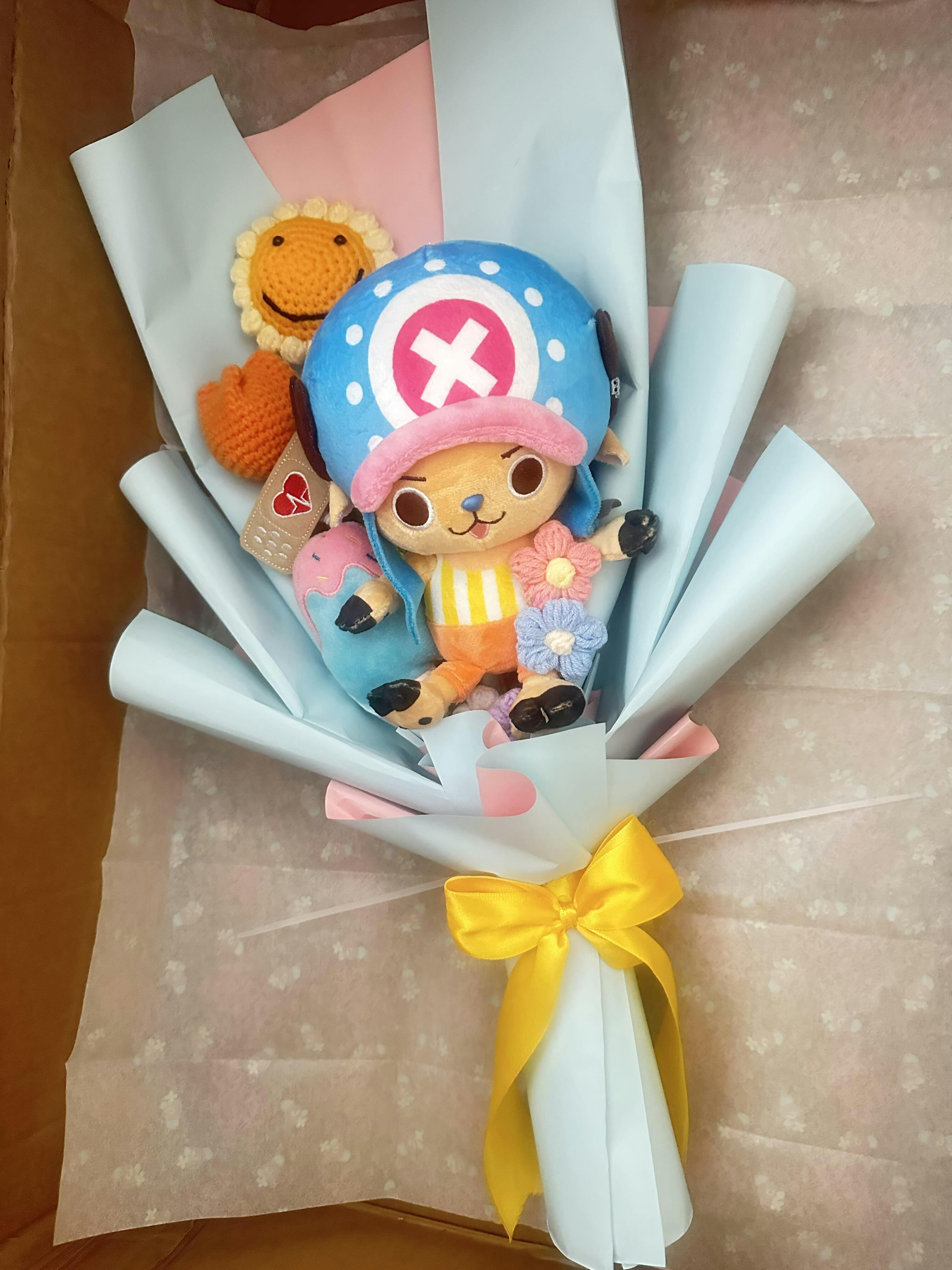 I enjoyed making this one and brining his personality into the bouquet so any anime fan can enjoy! I added pink, white, blue, orange, and purple crochet flowers along with an orange tulip to match his outfit, I’ve cream because, he loves treats, a sunflower to represent his warm personality and a bandage because, he the straw hat doctor. He is wrapped in a beautiful Korean blue with pink paper to represent his hat and the yellow ribbon is to match his stripped shirt.