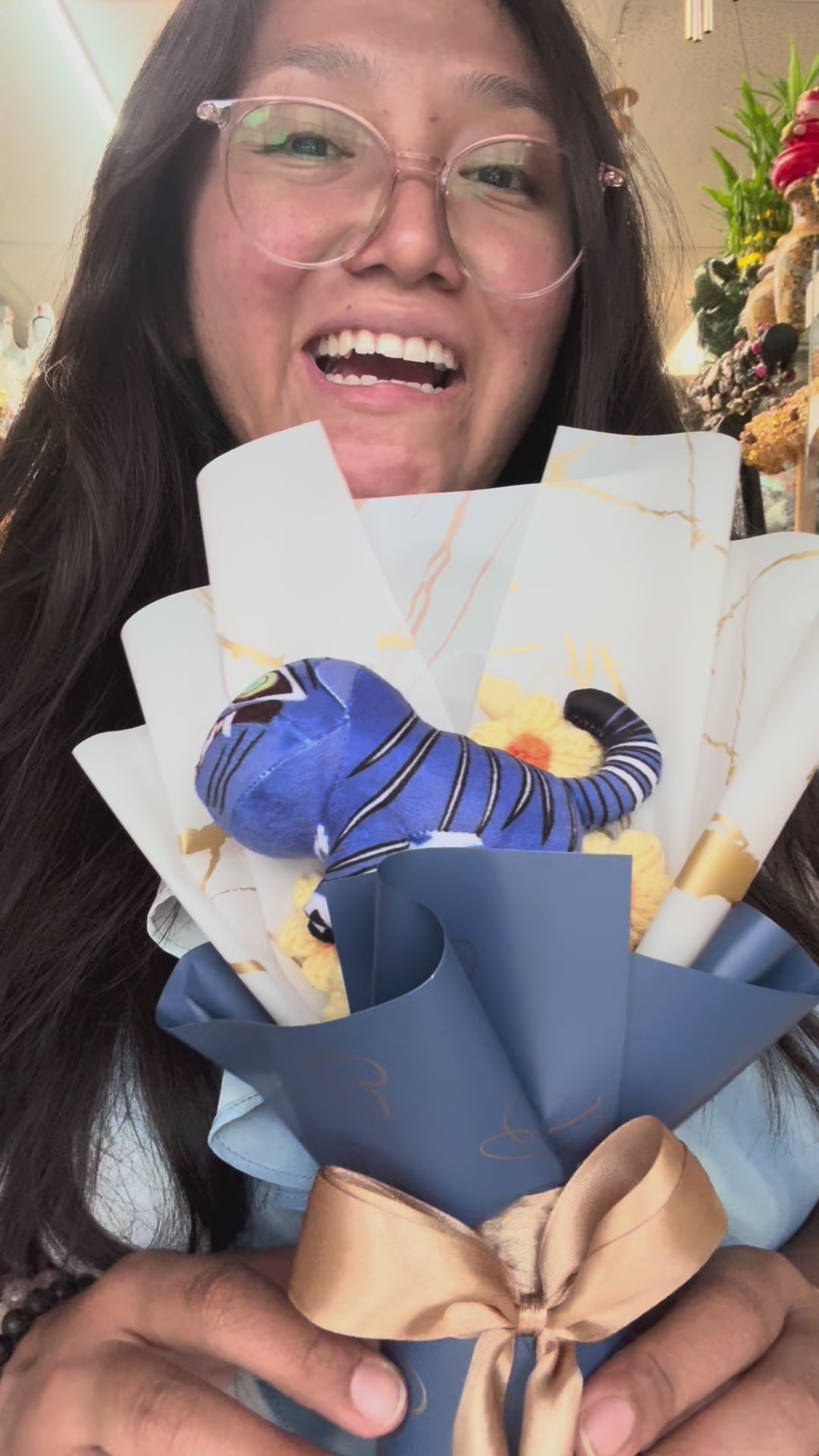 I had so much fun making this one and bringing out his personality into the bouquet so any kpop demon Hunter fan can enjoy! I added yellow crochet flowers to represent the gold hoonam. The white with gold Korean paper represents the lines and grid of the gold hoonam. The bow is gold to represent the gold theme and the blue with gold hearts Korean paper represents the positive energy to create the gold hoonam. The bouquet lights up a golden light to represent the hoonam being activated. This is a very unique and one of a kind bouquet.