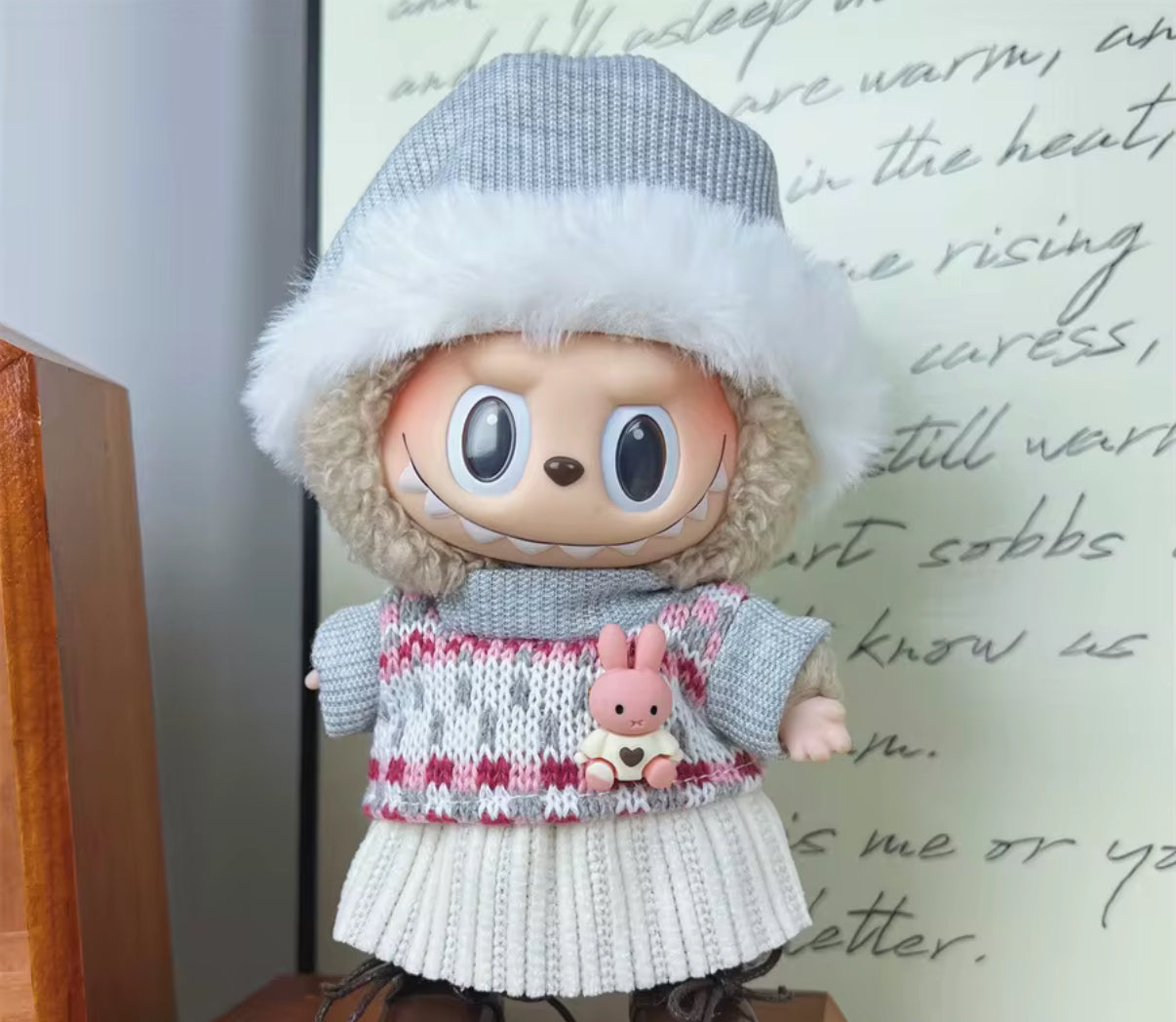 This is for one handmade winter outfit for your Labubu or 17cm doll. The outfit comes with a crochet sweater with a bunny and a grey with white fur winter beanie. They’re handmade so each piece may differ slightly.