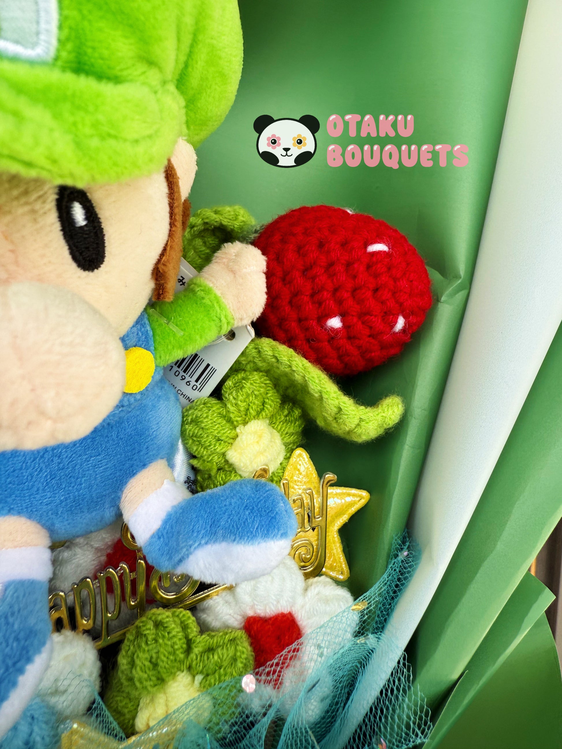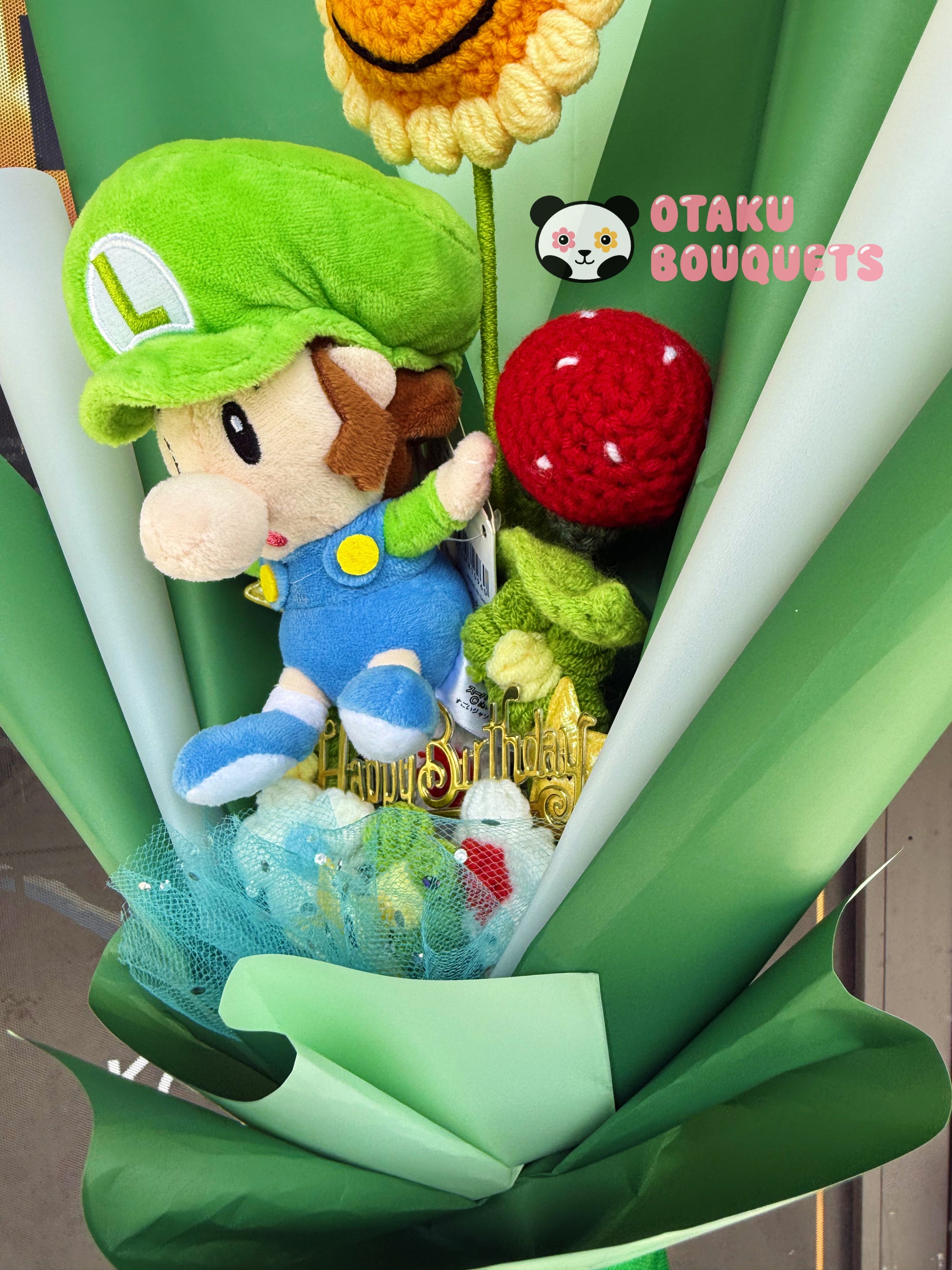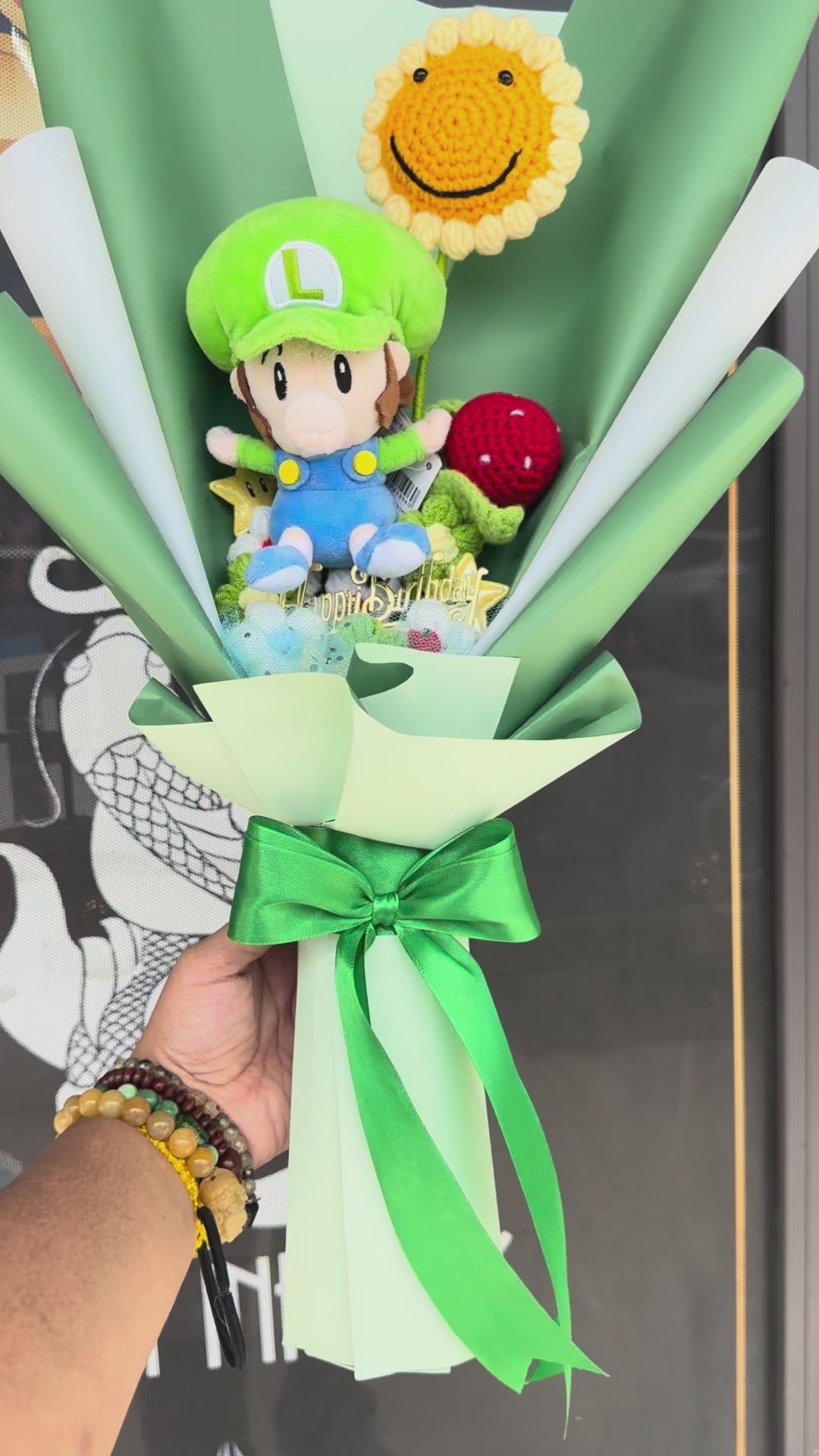 This is a Nintendo plush bouquet featuring Luigi. A custom piece. Featuring Luigi surrounded by stars that I hand painted eyes on and white with red crochet flowers that represents Mario, white and blue crochet flowers to represent his iconic overalls and green crochet flowers to represent Luigi himself. I added a happy sunflower to give the vibe of the game world he appears in and a crochet strawberry that I styled in a way to look like the piranha in the game. He is wrapped in a Korean green and white paper to represent his hat and he is tied with a green bow. I put an emphasis on the color green by request and I added a happy birthday sign that Luigi is sitting on.