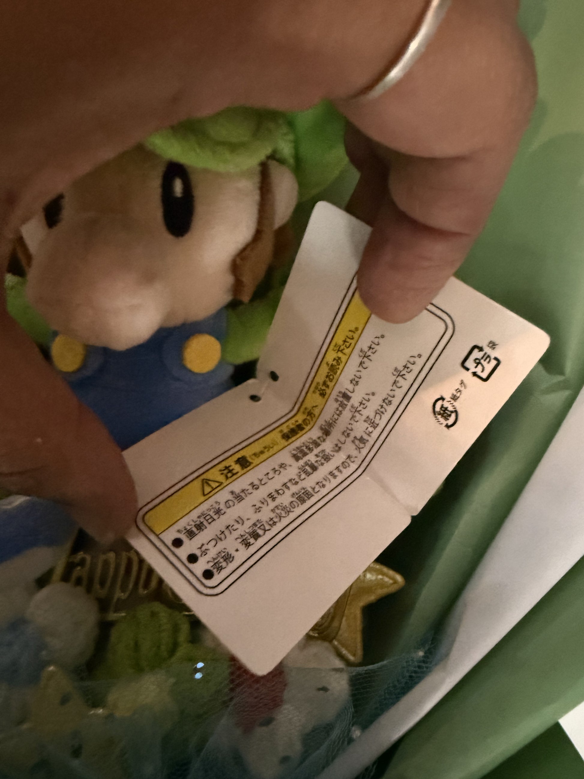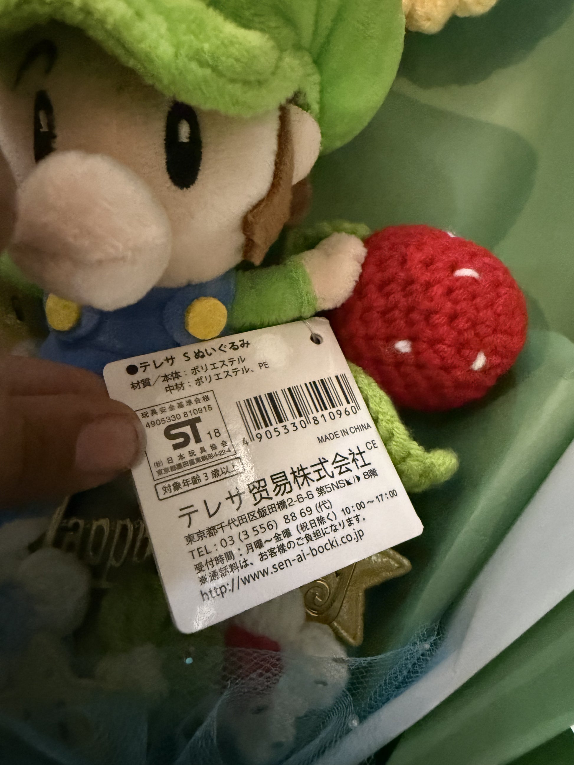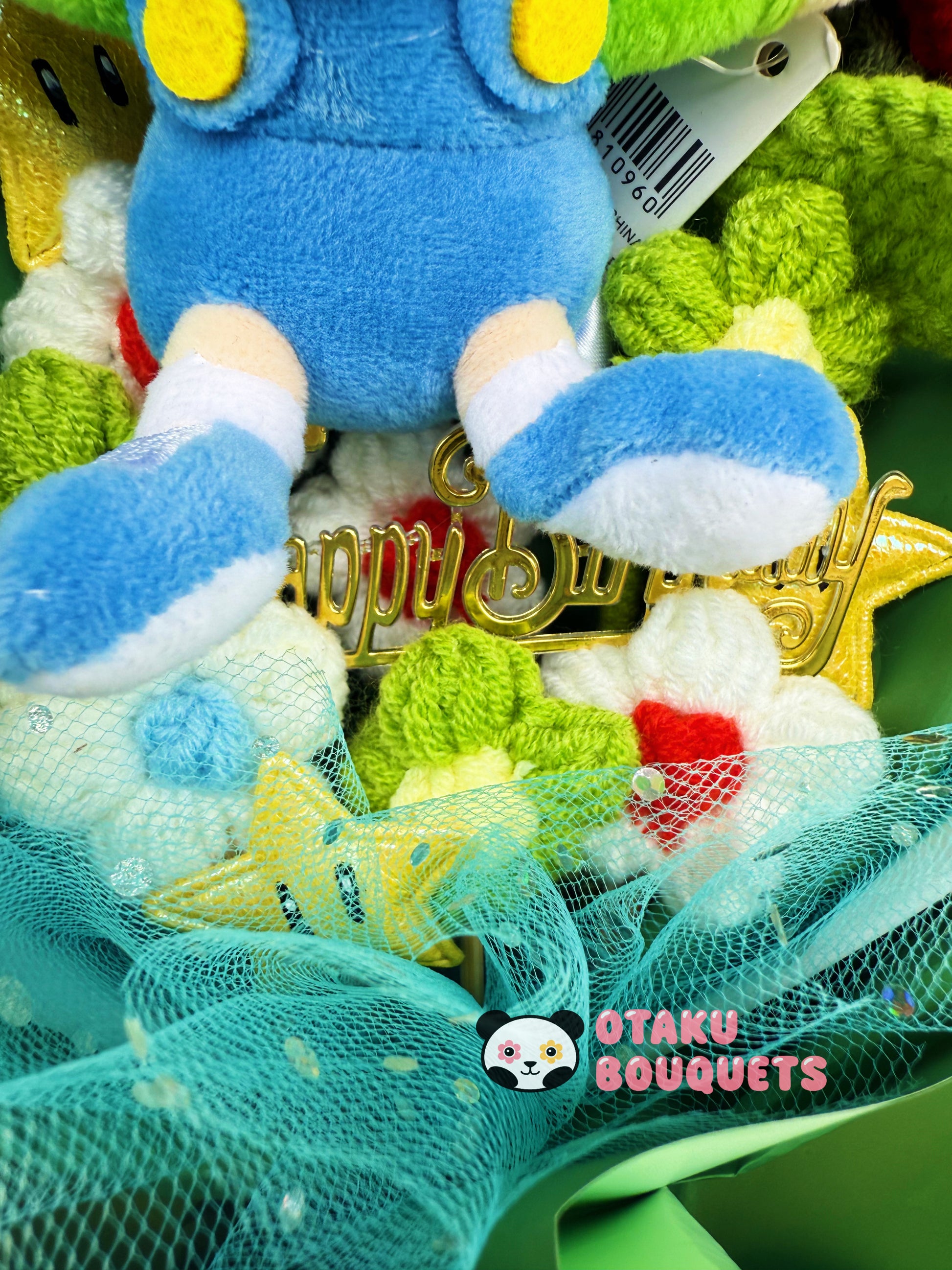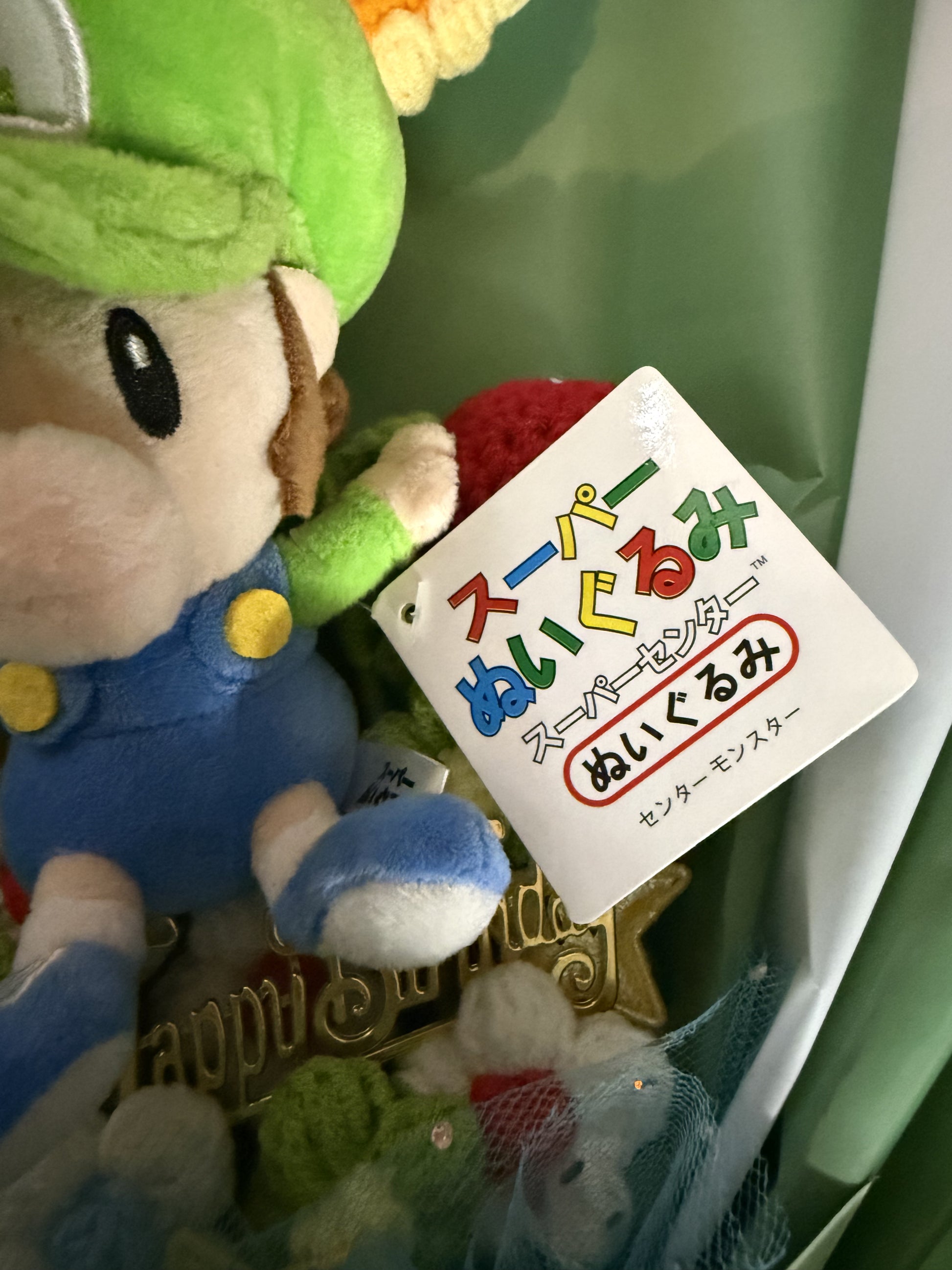 This is a Nintendo plush bouquet featuring Luigi. A custom piece. Featuring Luigi surrounded by stars that I hand painted eyes on and white with red crochet flowers that represents Mario, white and blue crochet flowers to represent his iconic overalls and green crochet flowers to represent Luigi himself. I added a happy sunflower to give the vibe of the game world he appears in and a crochet strawberry that I styled in a way to look like the piranha in the game. He is wrapped in a Korean green and white paper to represent his hat and he is tied with a green bow. I put an emphasis on the color green by request and I added a happy birthday sign that Luigi is sitting on.