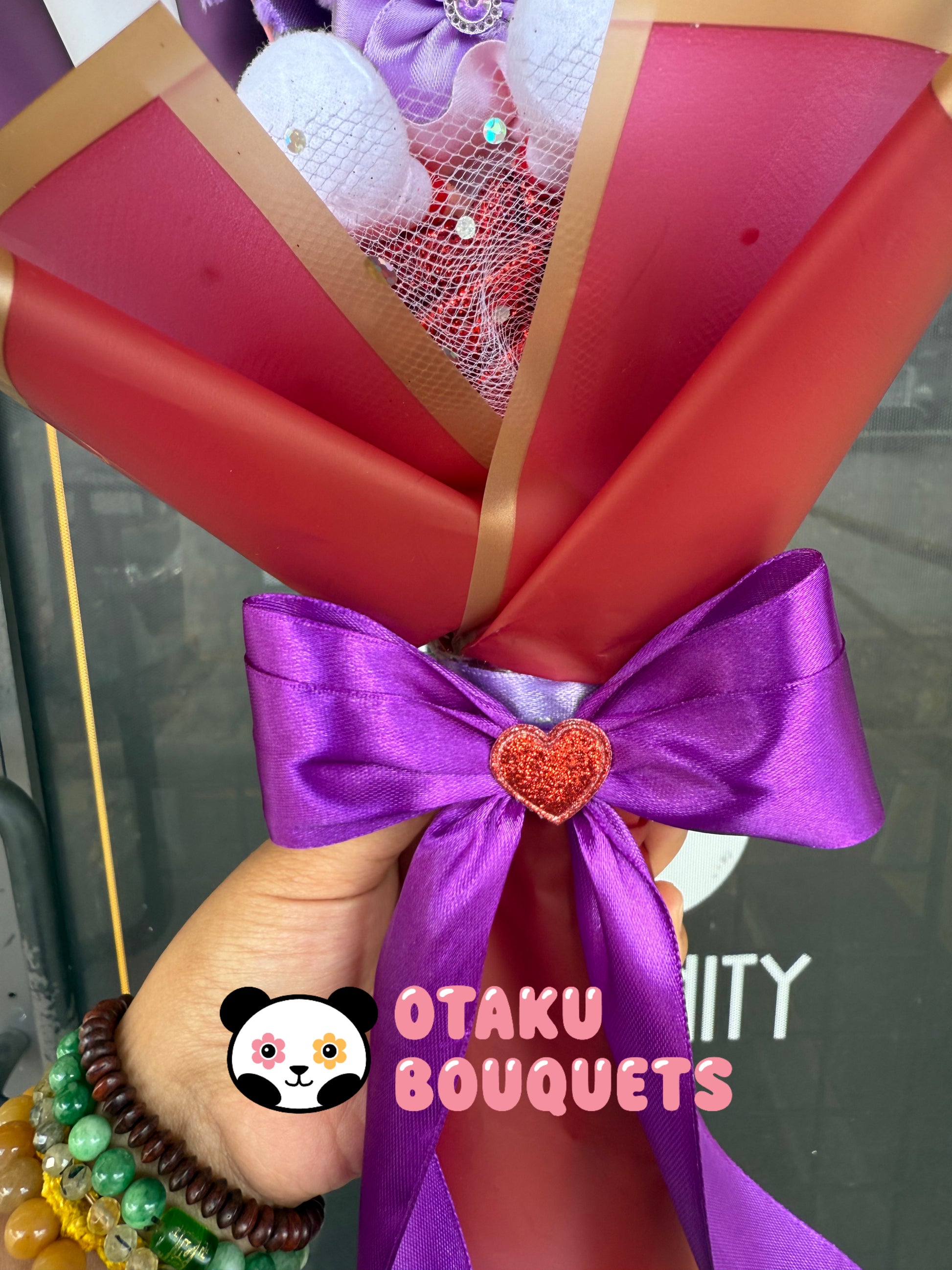 I had so much fun making this one and bringing out her personality into the bouquet so any anime or sailor moon fan can enjoy! I Added pink, white, and red crochet flowers to symbolize the colors of the scent she leaves. The red Korean paper features hearts that remind me of her hair. The bow is rose pink to match her bow on her transformation outfit and there’s a flying butterfly to symbolize the scent she leaves in the anime. The pink mesh features holographic circles that represents her being Galaxia’s star seed. This is a very unique and one of a kind bouquet.
