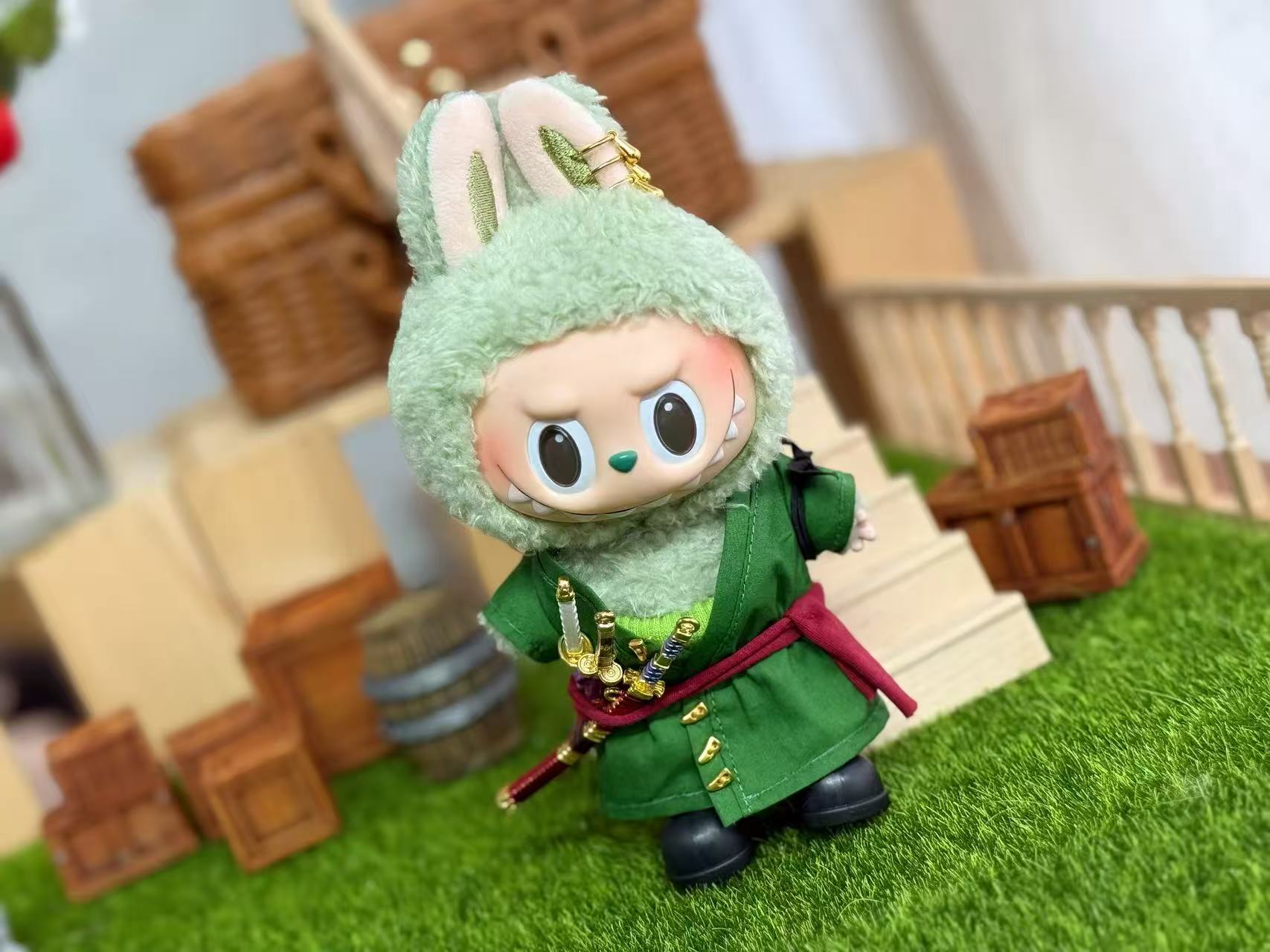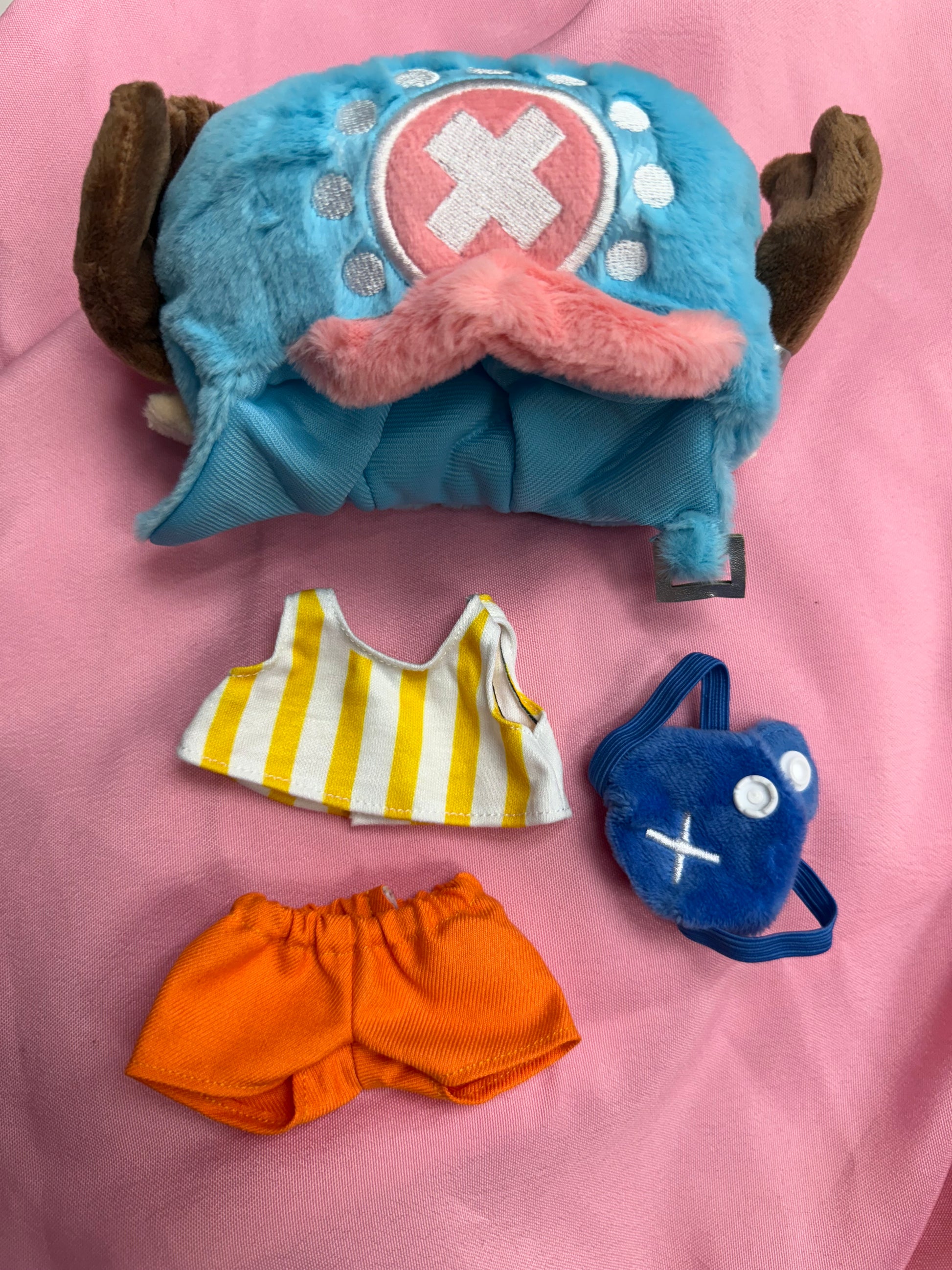This is for one “Pirates” Inspired handmade Cosplay/ costume for your 17cm doll. I have 3 options to choose from. You can get “Rubber Pirate” that comes with his iconic straw hat, red vest, and Jean shorts, you can get “Cute Reindeer Doctor Pirate” that comes with his iconic post time skip hat, stripped yellow and white shirt, orange shorts, and book bag, you can get “Swordsman Moss Pirate” that comes with his iconic 3 swords, green kimono, shorts, and earrings.