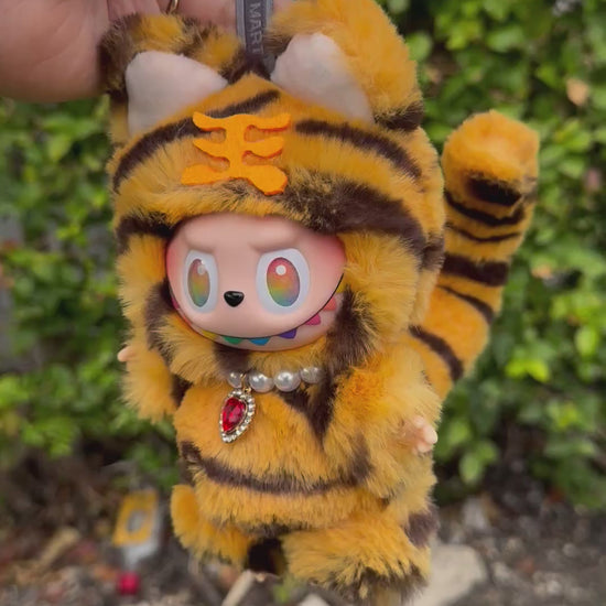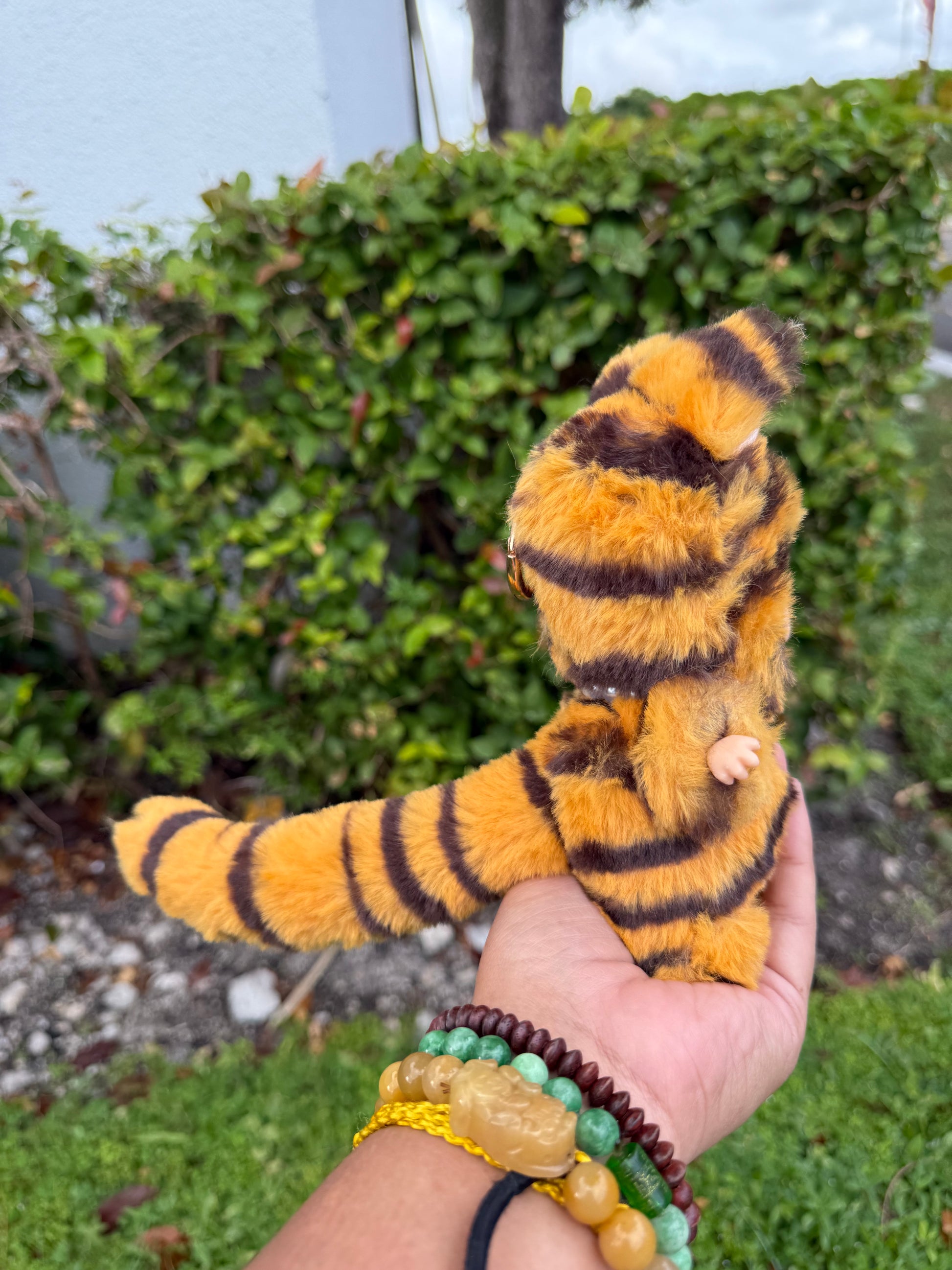 This is one handmade doll in the shape of a tiger! Each piece is crafted with love, so slight variations may occur. A picture of the final product is provided for reference. You can also ask for pictures so you can choose the one you want of what I have made and available to ship out. This tiger doll is made out of an orange brown with black stripped synthetic fur. The face is decorated. They all come with a random accessory, you can request a specific one if you wish.