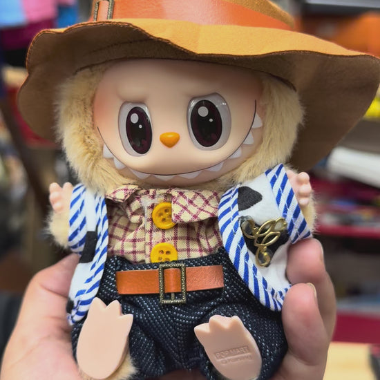 This is for one cowboy outfit for your 17cm doll. The outfit comes with a brown cow boy hat, a plaid shirt, a cow print vest, and Jean pants.