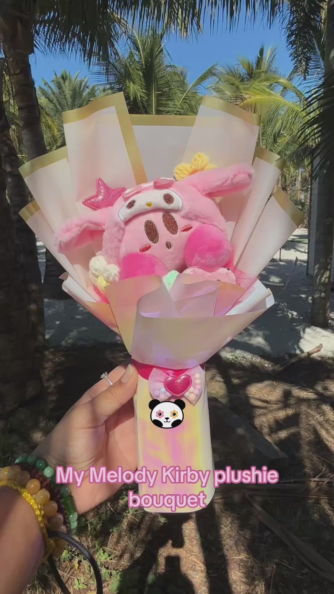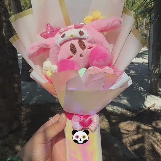This bouquet features the plushie pinned so it is not damaged. The plushie is surrounded by crochet flowers to match the iconic pink bunny’s color of pink, the mesh in pink to also match the outfit and this bouquet is wrapped in a Korean paper of the color pink and iridescent to match the bunny’s colors.