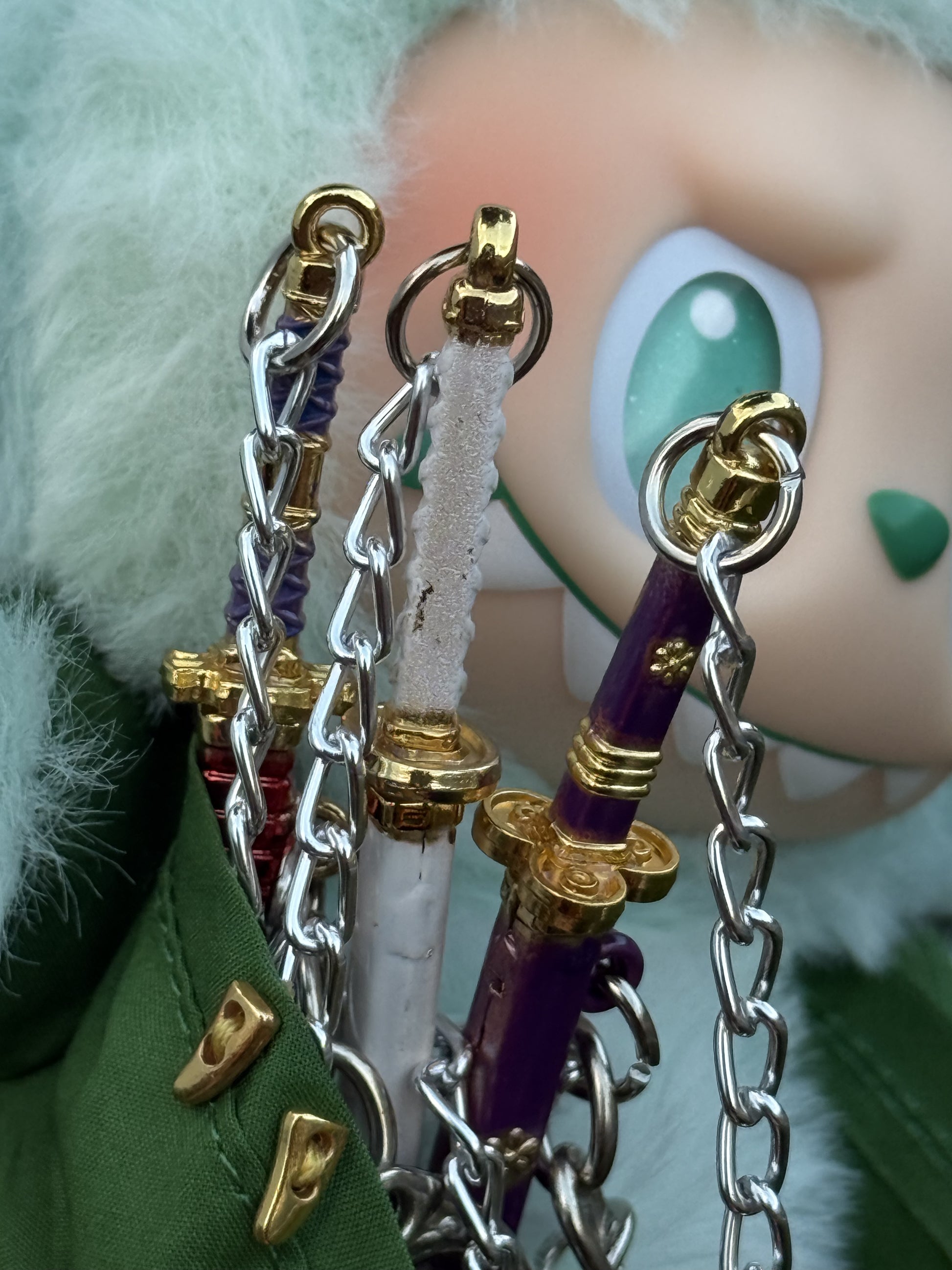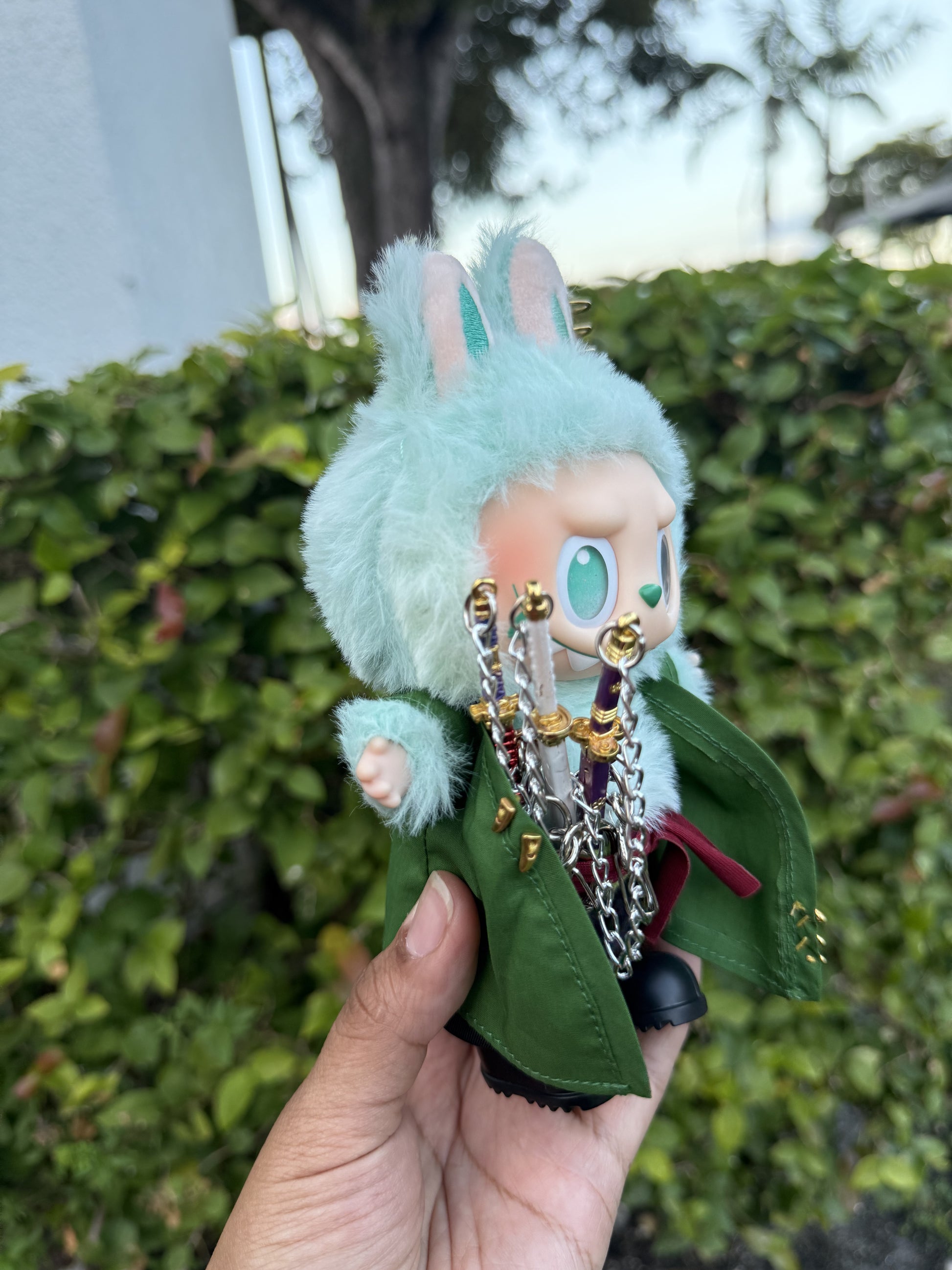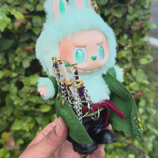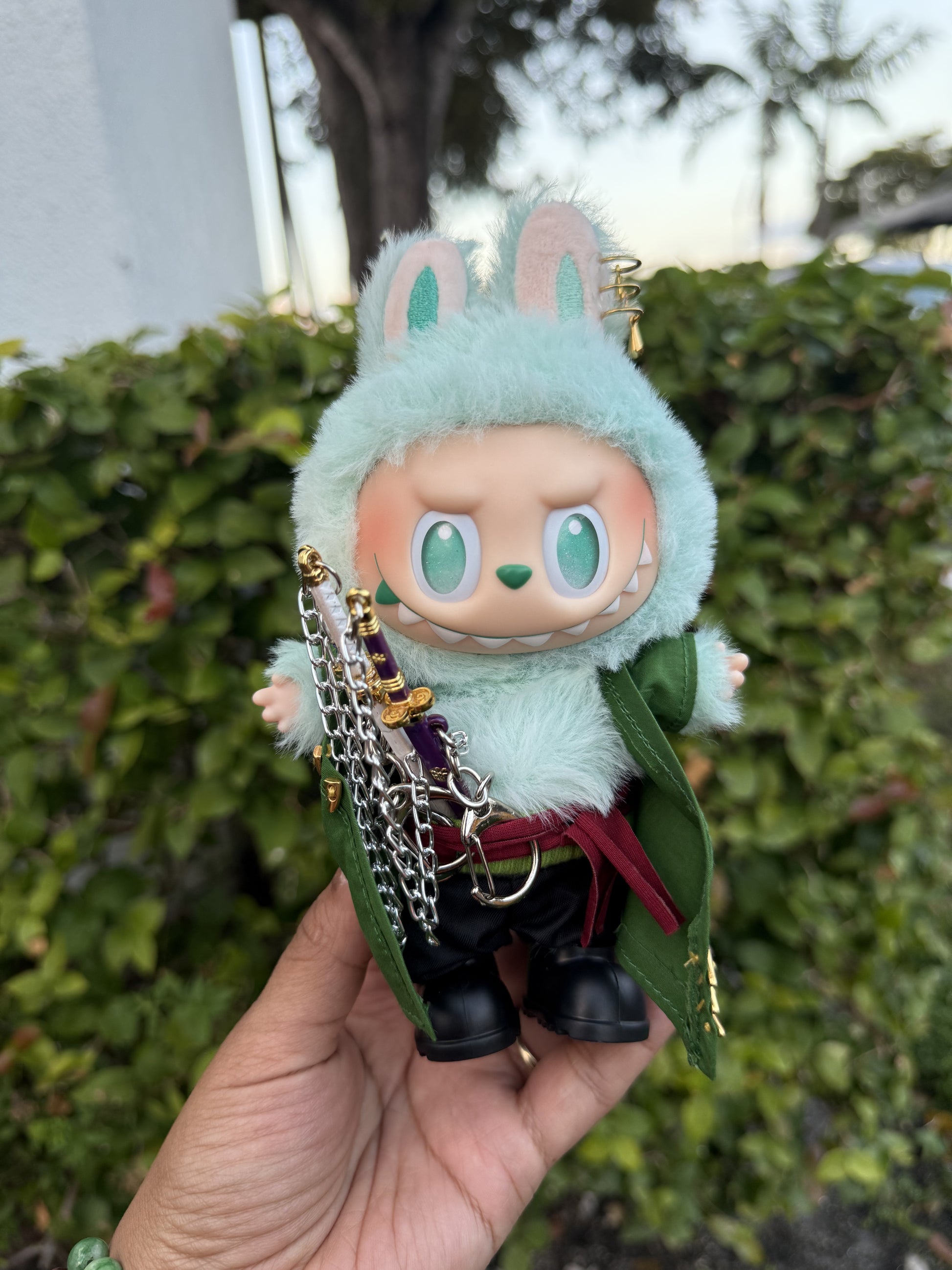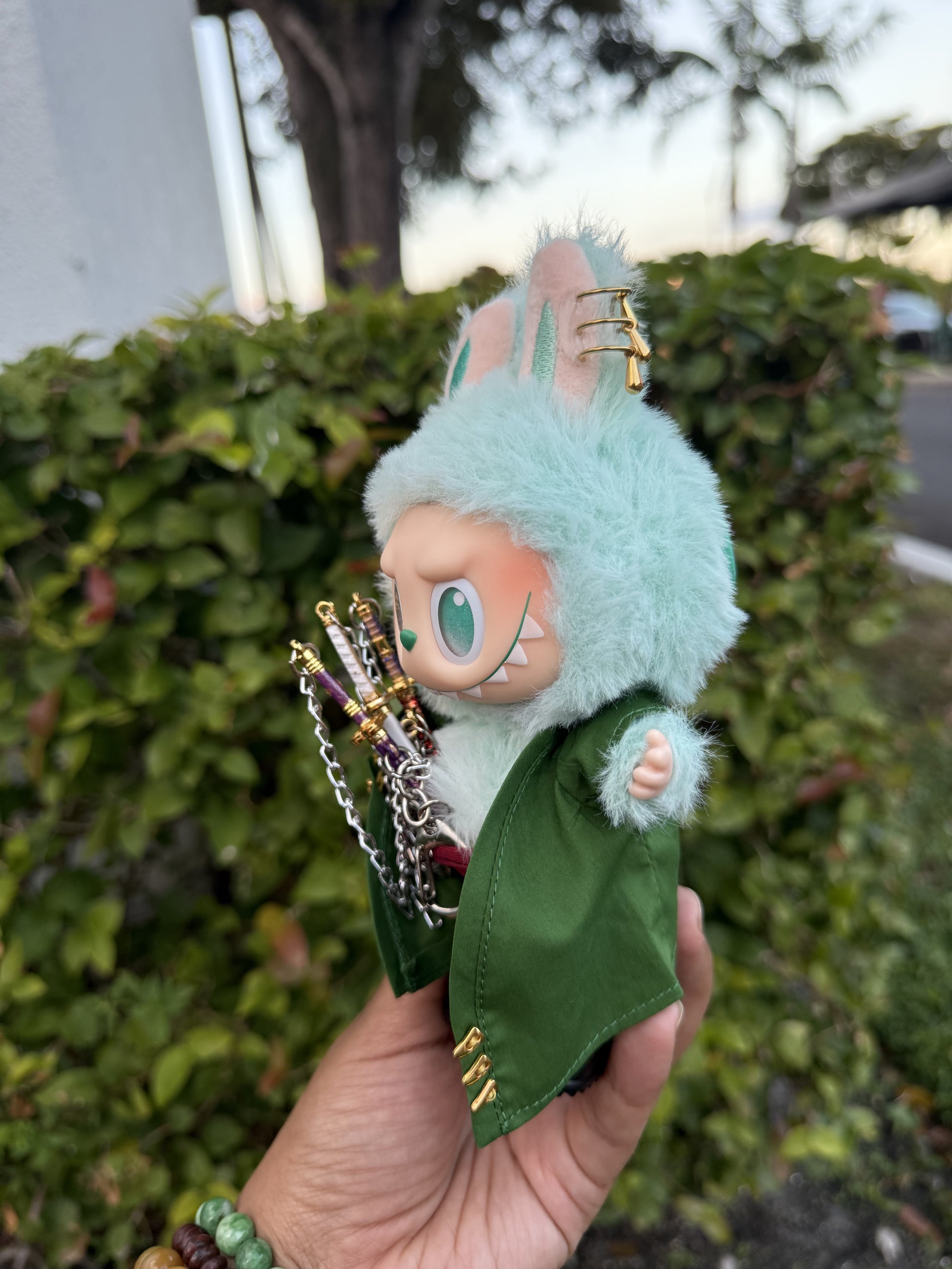 This is for one handmade costume for your Labubu or 17cm doll. The cosplay comes with the green kimono, his 3 swords, black pants, boots; and earrings. They’re handmade so each piece may differ slightly.